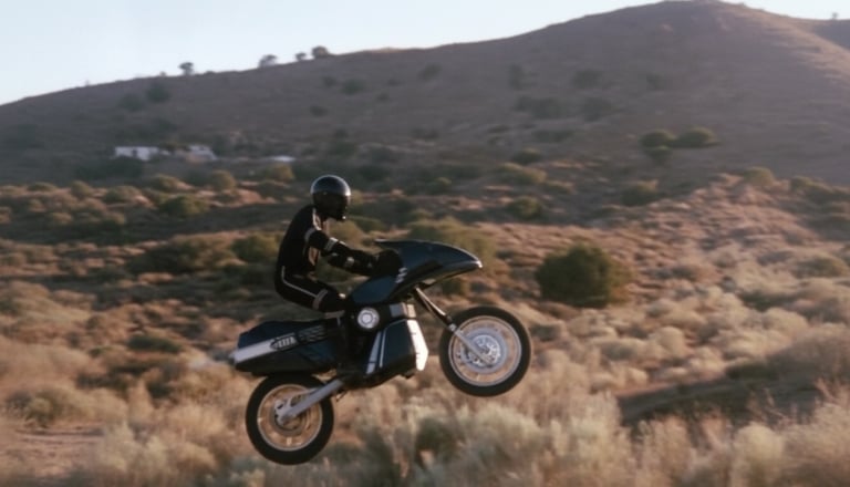 Além do design, havia o arsenal. A Motolaser ficou conhecida pela chamada “velocidade Mach 1”, licença poética que a levaria a mais de 480 km/h. Embora isso fosse impossível na prática, a produção recorria a cortes rápidos, câmeras lentas, ângulos estratégicos e saltos coreografados para criar a ilusão de aceleração extrema.